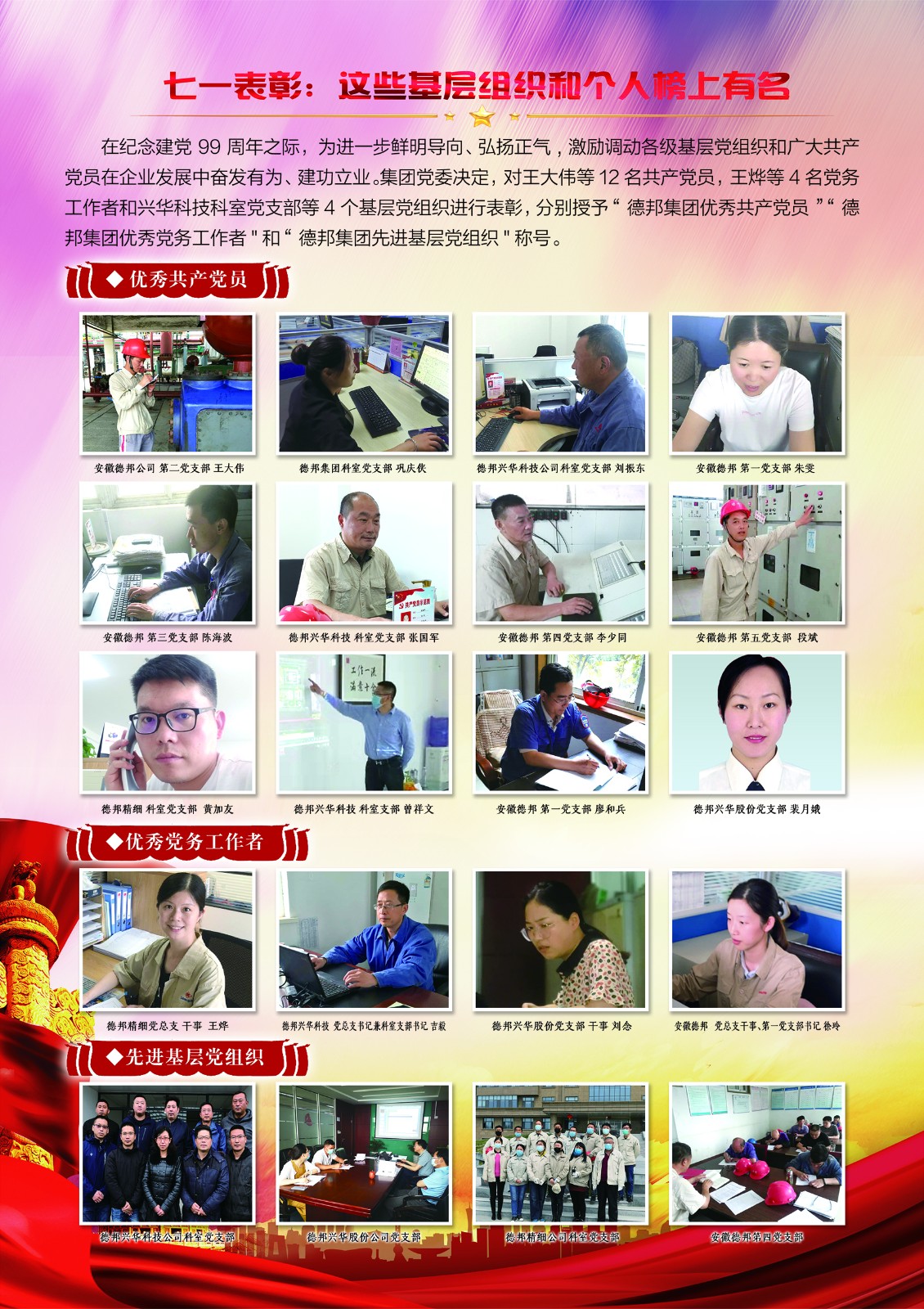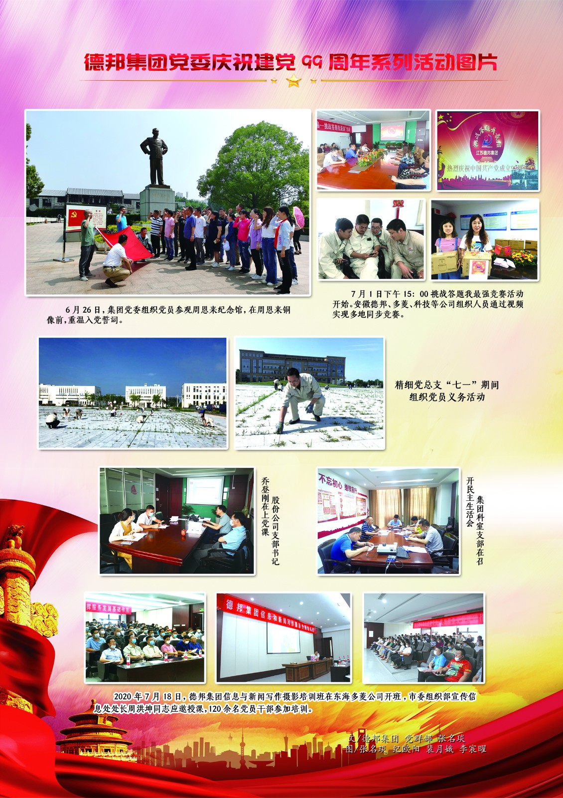 2020年是建黨99周年,為熱烈慶祝黨的生日,貫徹落實2020年兩新組織黨建工作要點,進一步增強各基層黨組織活力、激發(fā)黨員的使命感、責(zé)任感,德邦集團黨委在“七一”前后開展挑戰(zhàn)答題我最強、專題民主生活會、優(yōu)秀黨員等先進評選、參觀周恩來紀(jì)念館、黨員讀書活動、黨支部書記上黨課、黨員為安全獻(xiàn)言等系列活動慶祝中國共產(chǎn)黨建黨99周年。